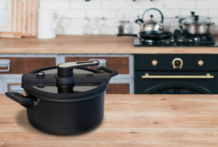 Non è una pentola a pressione tradizionale, non raggiunge al suo interno pressioni elevate ma una sovrappressione "gentile" che riduce i tempi di cottura ed evita inutili sprechi di energia. Il coperchio dalla facile apertura permette in ogni momento l'aggiunta degli ingredienti e controllare le fasi di cottura. La doppia valvola di sicurezza bilancia la pressione all'interno della pentola , senza fuoriuscita di odori e preservando le proprietà degli alimenti.